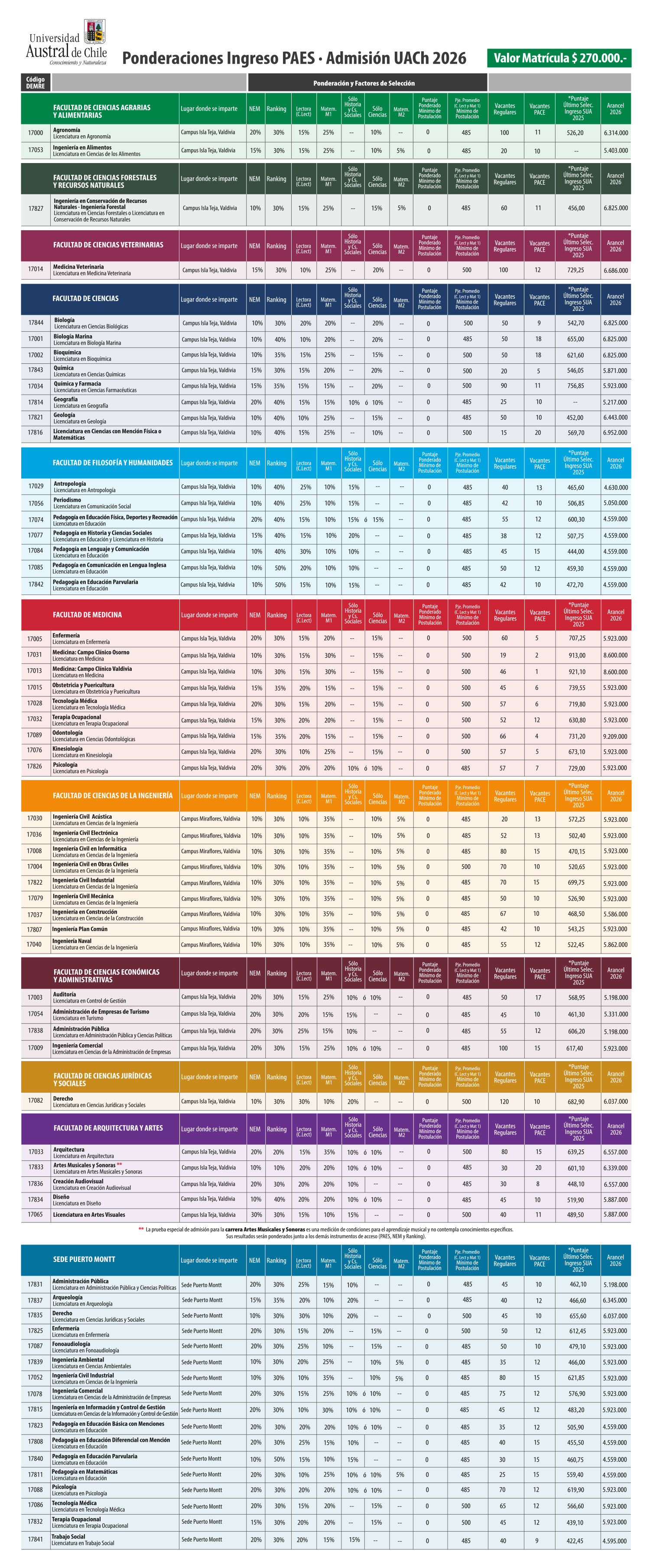 La oferta académica de la UACh para este proceso de admisión, las ponderaciones, vacantes por carrera y sus planes de estudios, los puedes encontrar en nuestro sitio web uach.cl/admision