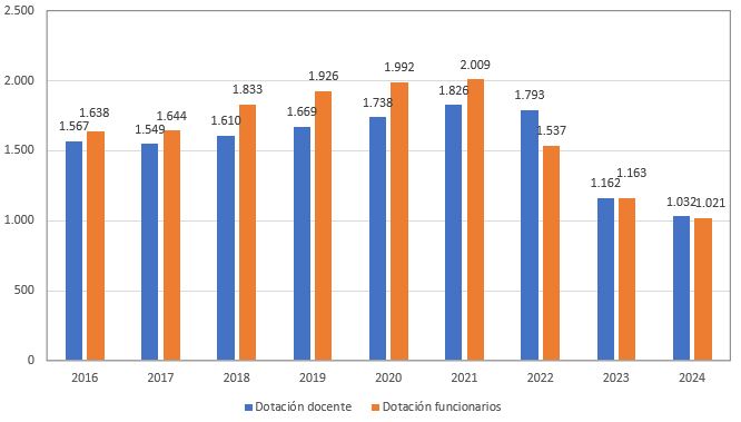 | Dotación docente | 1.567 | 1.549 | 1.610 | 1.669 | 1.738 | 1.826 | 1.793 | 1.162 | 1.032 |